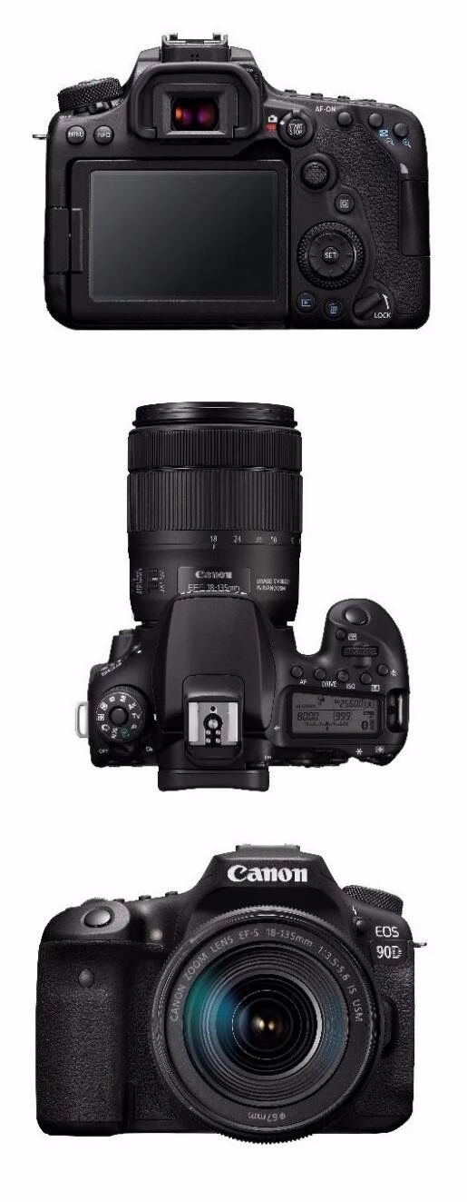 佳能新款的EF-S机身延续传统的命名规则叫作EOS 90D,造型方面跟80D基本一样但是从50D后就失传已久的对焦点选择摇杆又回来了,或许是因为对焦点数量增多再不用摇杆选择的话会很麻烦,或者只是单纯的佳式挤牙膏放牙膏,不过其它方面跟80D看不出什么明显的区别。