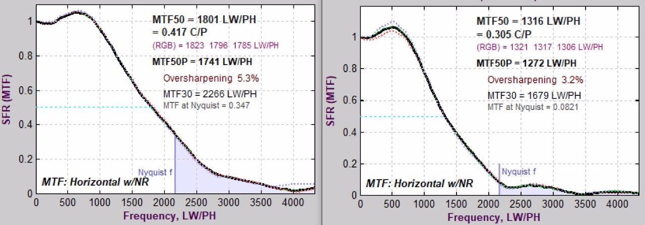 视频模式SFR测试——左为裁切模式4K,右为非裁切模式4K