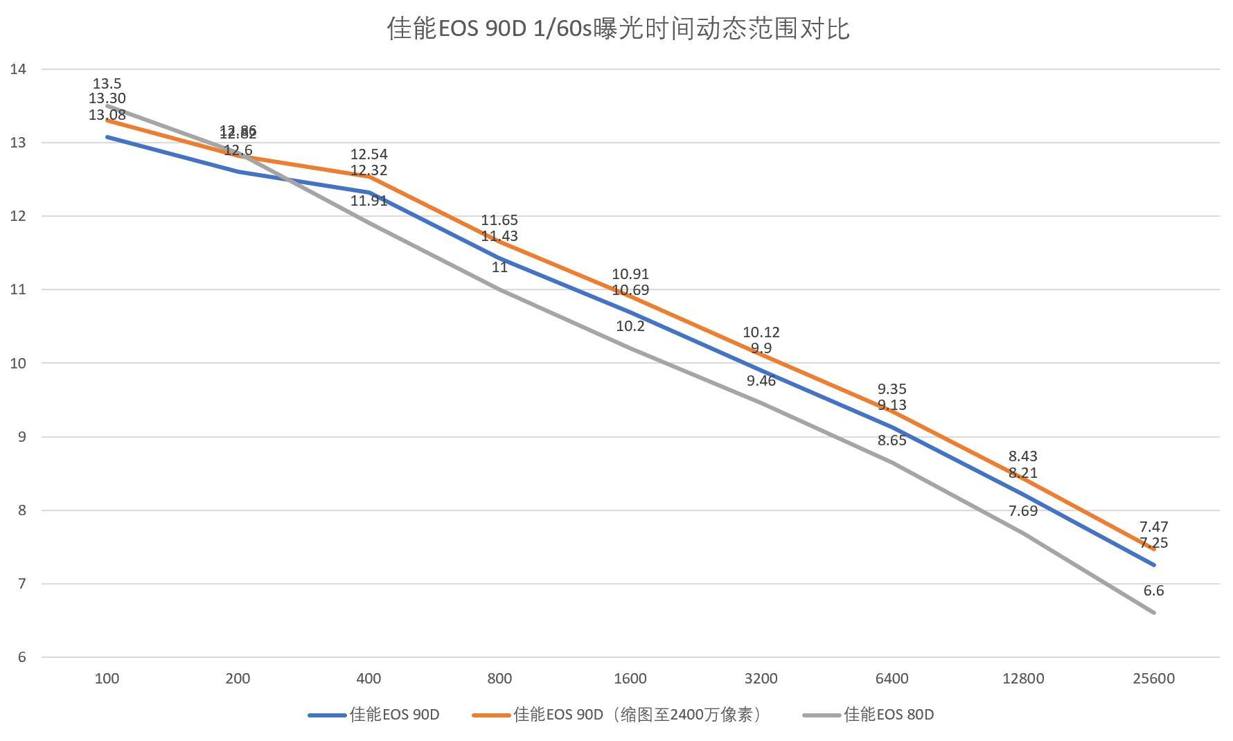由于涉及到不同像素数量机器的对比,需要提供缩图与不缩图两方面结果,所以我们单独把动态范围的数值重新做一个图表。