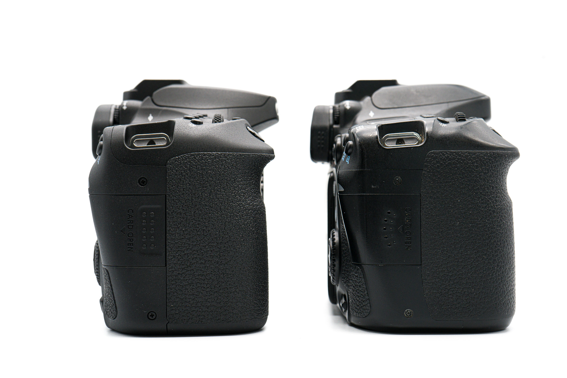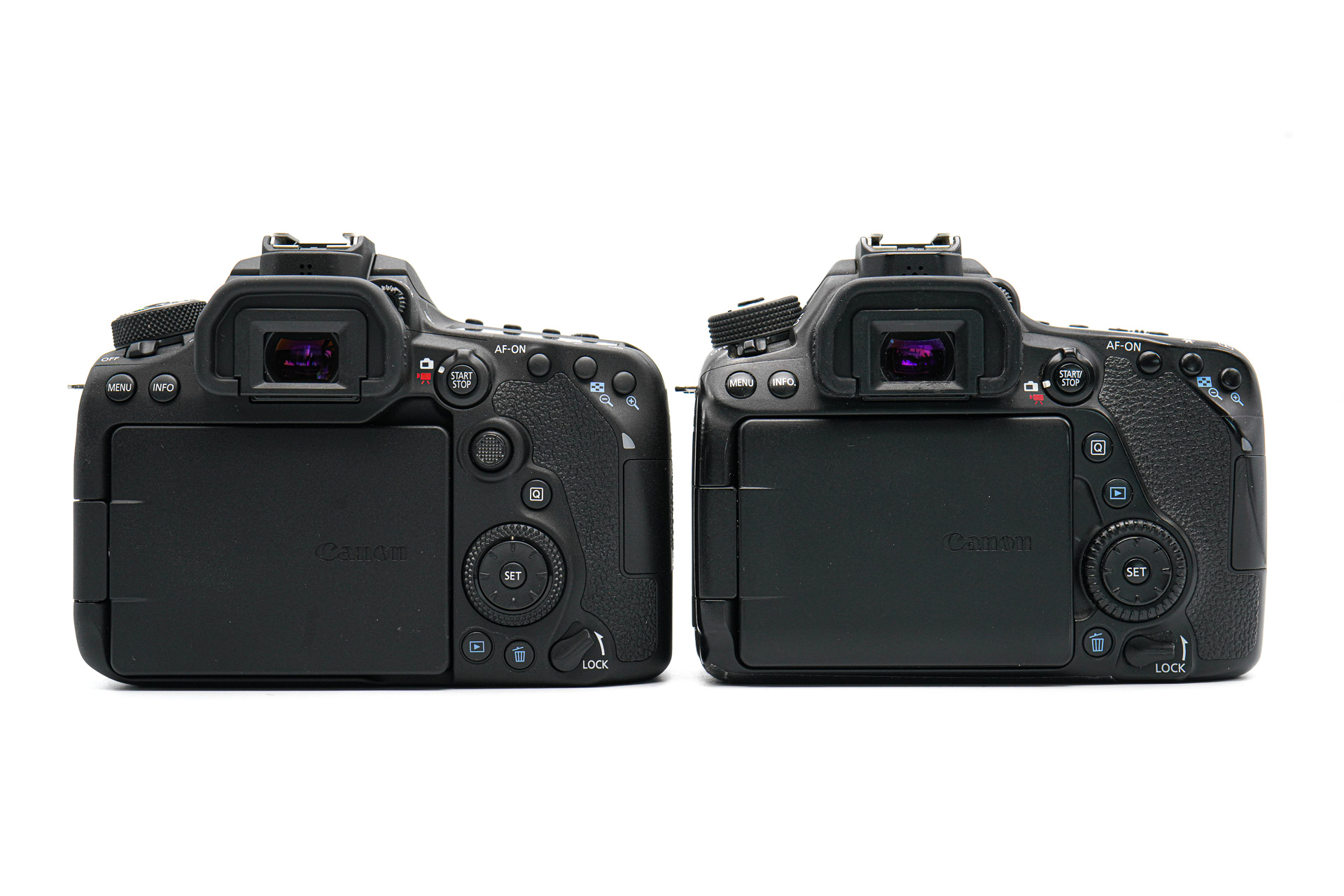 背面倒是有一点可见的变化(左边是EOS 90D),最明显的就是终于把从EOS 60D开始就在两位数机身上阉割掉了摇杆又给接回来了,真是天道好轮回。相应的被摇杆挤占了空间的Q键和播放键也重新排列。然后这些按键又挤占了把翻转屏抠出来的那个槽的位置,于是那个槽就挪动到了取景器右下角,再相应的这个槽挤占了LV拍照/视频模式切换的标识位置,于是这个标识也整体往上移动——所以实际上EOS 90D相对于EOS 80D背面的变化基本都是因为这一个摇杆而产生的连锁反应。