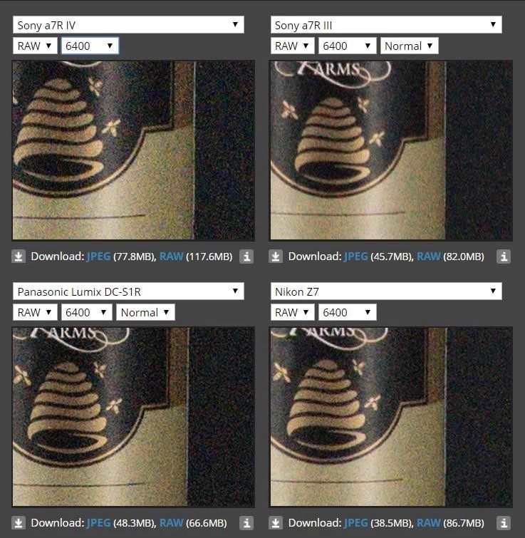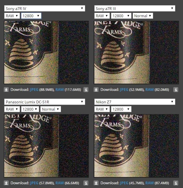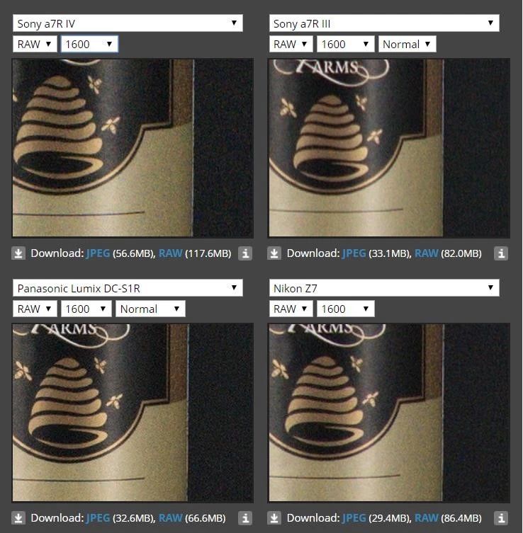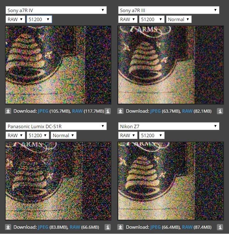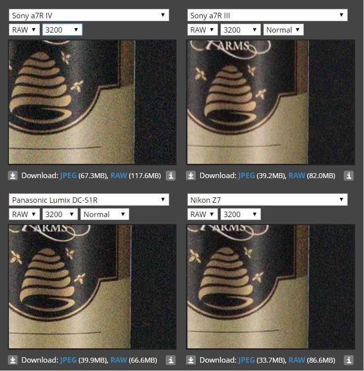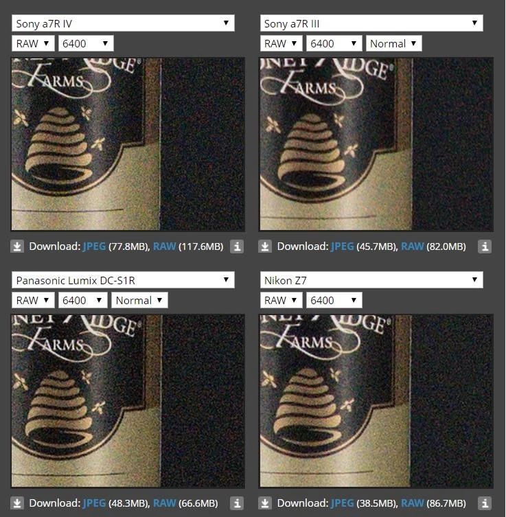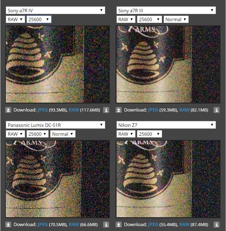 的方法,借助他们的软件我们可以非常直观的比较索尼α7R IV,α7R III,松下S1R以及尼康Z 7这几款高像素微单的高感画质: