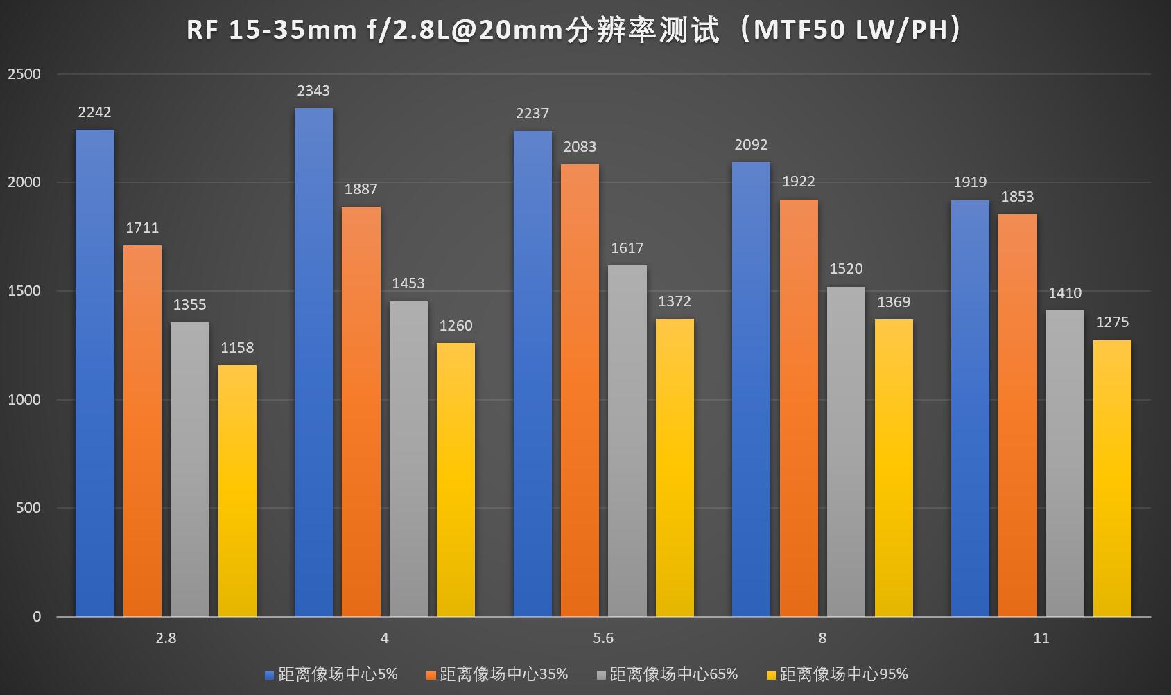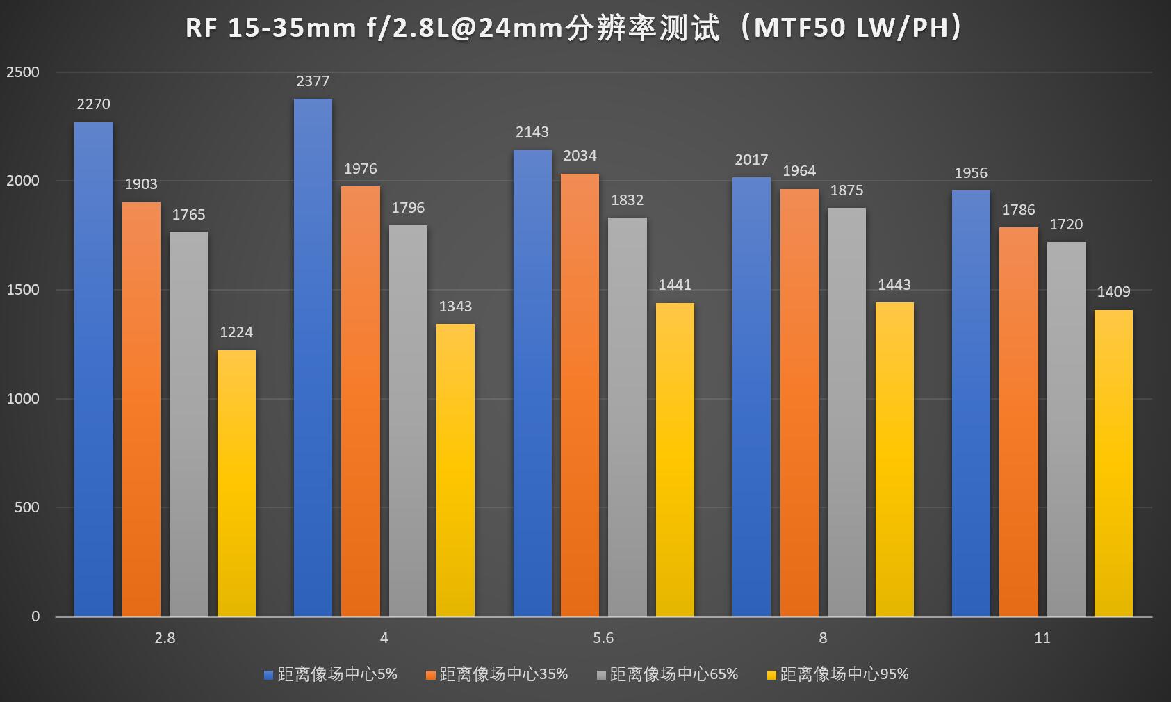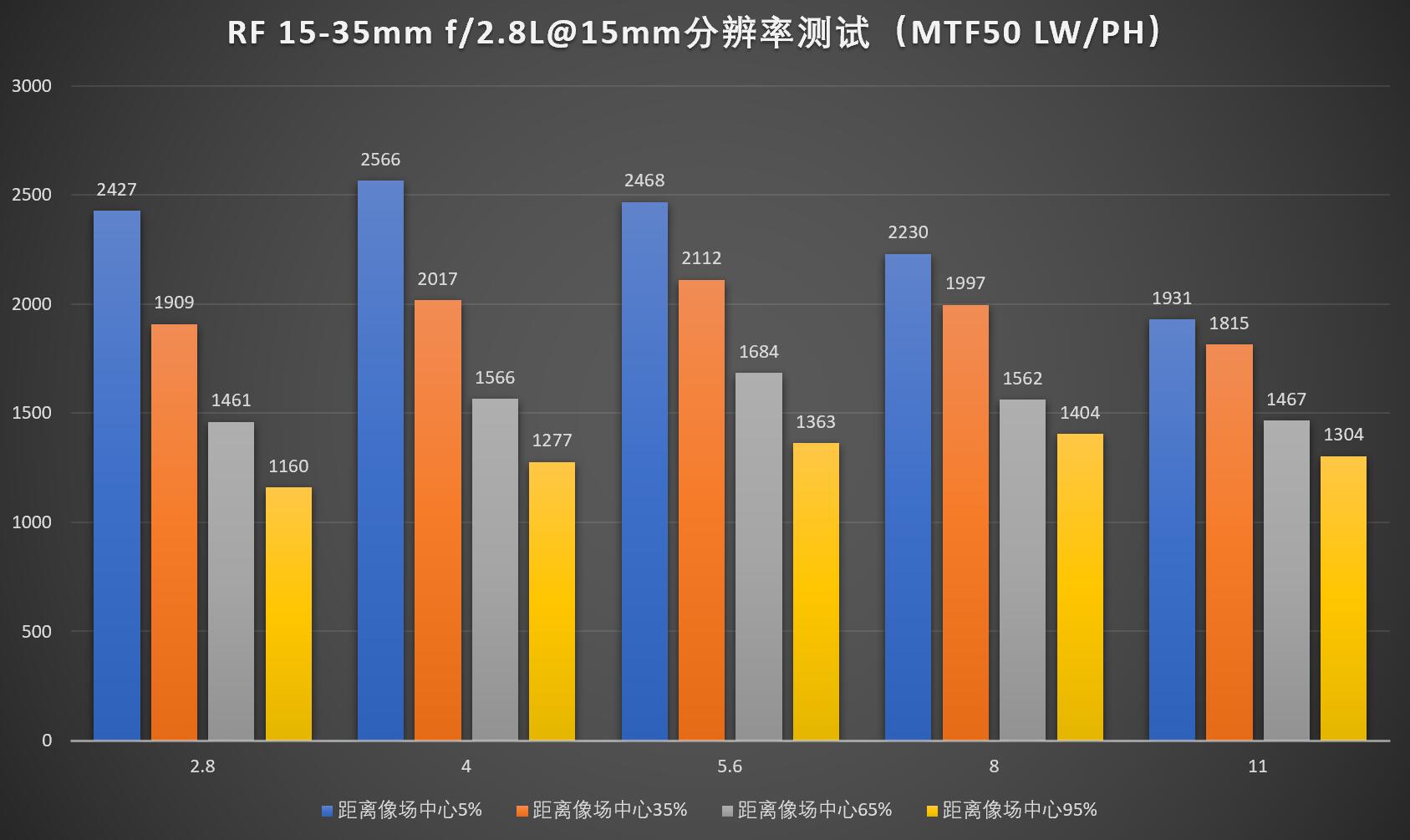 不过一转攻势——上面这一段是基于数字趋势做的评级,但是具体到数值上来看好在这支镜头f/5.6和f/8的中心画质虽然不如f/4,然而衰减也不是很明显,从f/2.8到f/8画质表现都差别不算太大,换个角度来说就是这支镜头具有不错的可用光圈范围——从这方面来说,再配合分辨率对焦距的分布,佳能给RF 15-35mm f/2.8L的定位,大概就是一支万金油超广角镜头吧。