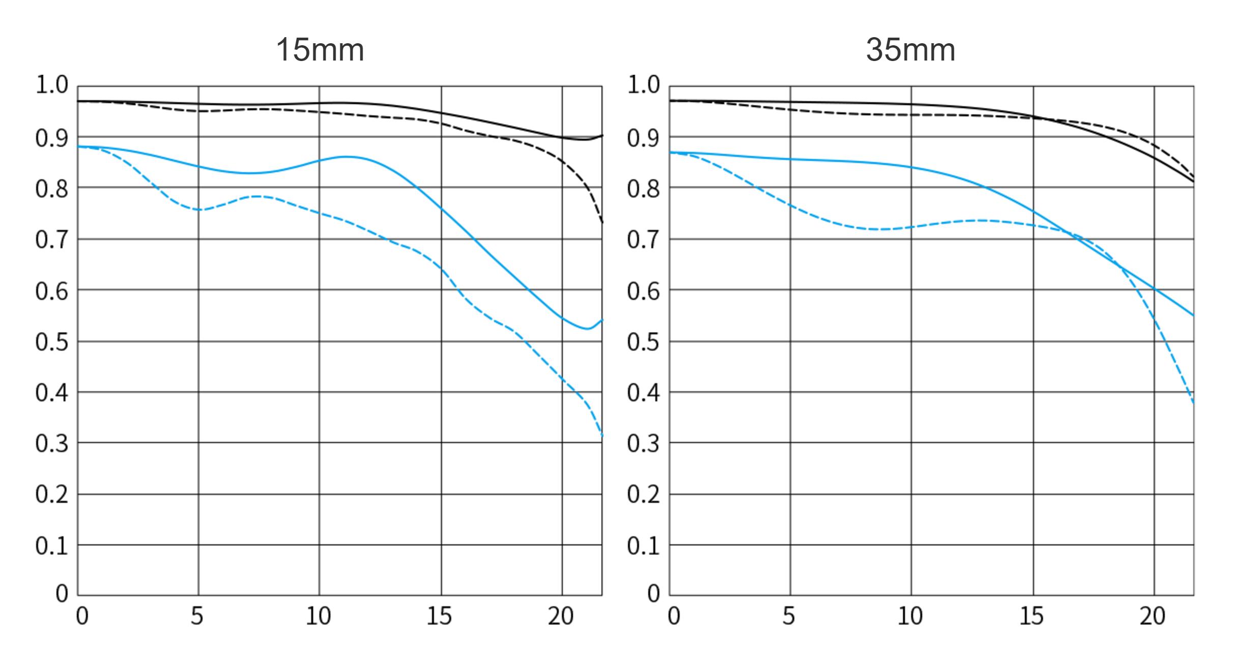 这支镜头的畸变特征也非常有意思,广角端是明显的桶形畸变,但是除了15mm最广角端之外剩下的都是差不多的枕形畸变,数值的绝对值方面都在1%~2%,可以比较轻松的通过后期软件来做修正。