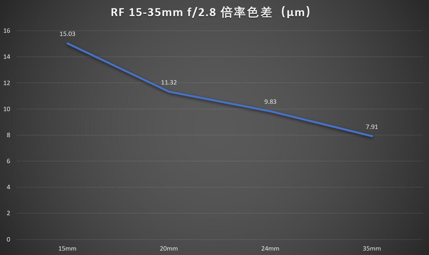 分辨率-焦距分布契合度:高,RF 15-35mm f/2.8的所有焦段分辨率水平基本上都是一致的,但是相对而言35mm端还是略差一些,跟EF 16-35mm f/2.8L III的两头强分布不太一样。考虑到35mm f/2.8端全开拍摄人像/静物也是这种规格镜头的重要用途之一,我们只能给这支镜头“高”的评级。如果35端哪怕中心画质做到跟15mm端基本一致的水平,那这就又是在我们的点评当中获得单项“极致”的一支镜头了。
