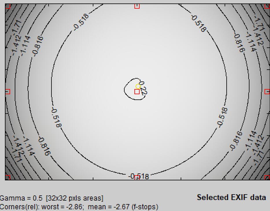 作为一支平面前组大光圈超广角,这个特性就注定了RF 15-35mm f/2.8L的暗角得分不会太好看。最大光圈广角端暗角接近3EV,长焦端好一些。