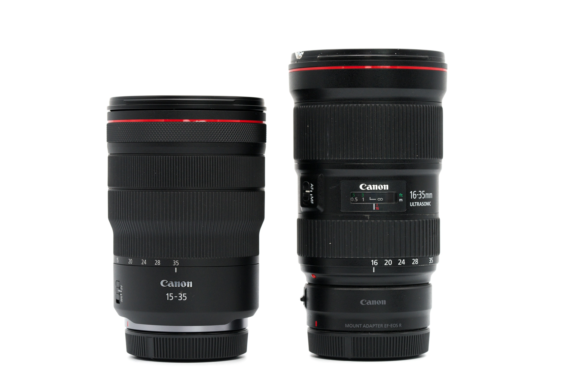 与EF卡口广角大三元EF 16-35mm f/2.8L III的体积对比,不算转接环长度的话两者差不多,都用在RF机身上的话RF 15-35mm f/2.8L相当于是短了一个转接环的长度。