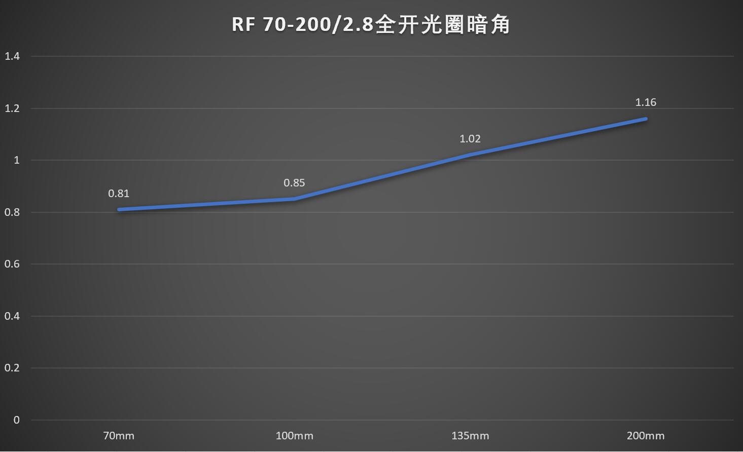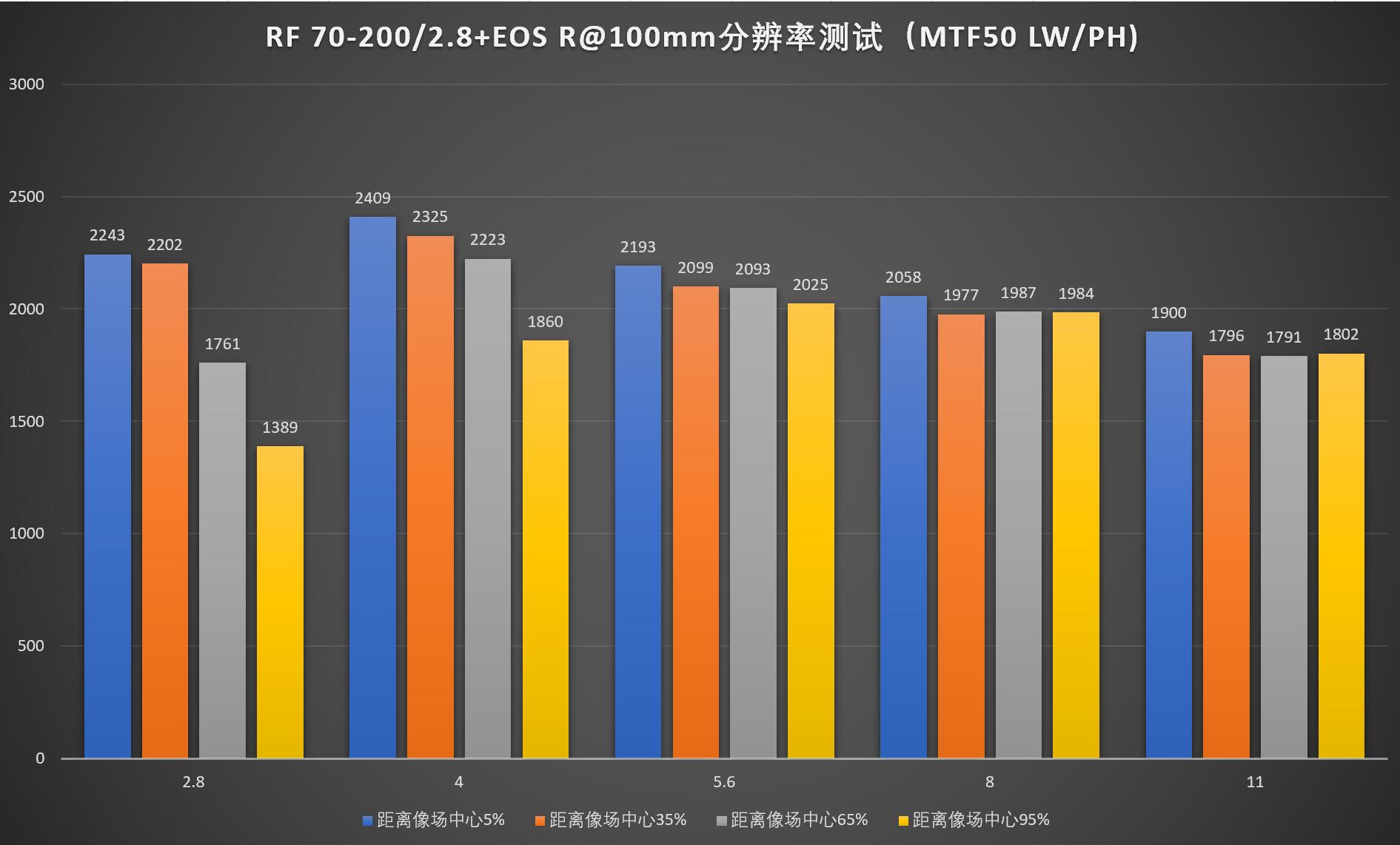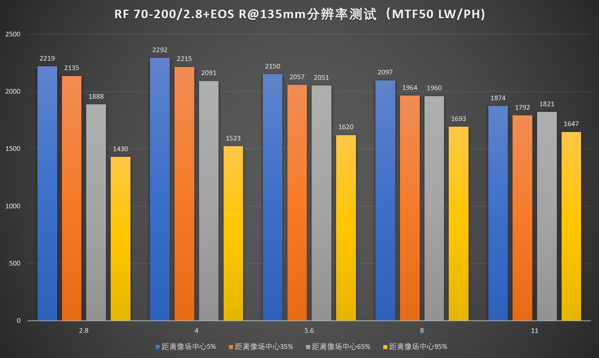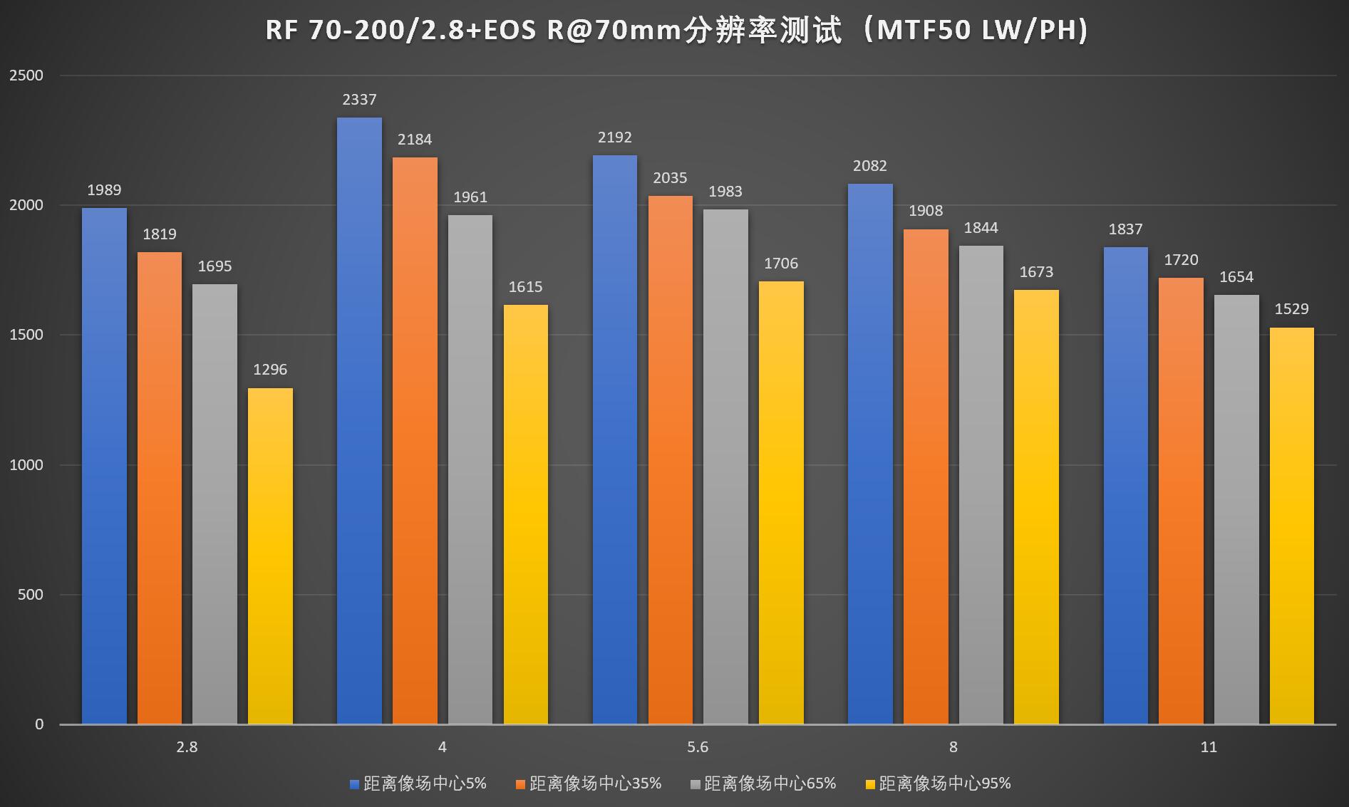 分辨率-焦距分布契合度:高,这支镜头分辨率随焦距的分布比较平均,各个焦距下的分辨率水平都比较接近,相对来说70mm端稍差,中间的100-135mm最好,然后200mm有一点点差距不大的下降。既然选择了长焦镜头那么肯定常用的还是长焦,RF70-200在各个长焦焦段下的表现比较均一稳定。扣一档分数主要还是因为200端不是最佳焦距(虽然确实要做到200端最佳也比较困难)