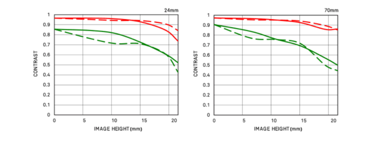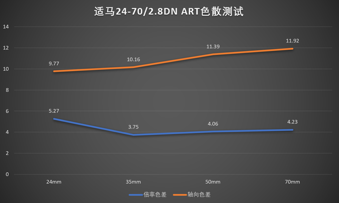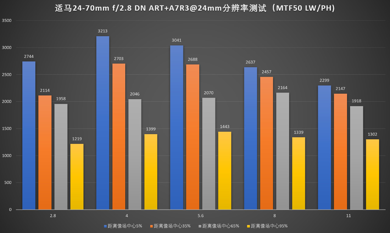 分辨率-焦距分布契合度:中,分辨率随焦距的关系是越长越低,广角端表现不错,长焦端一般。24-70mm f/2.8规格的镜头使用过程中长焦端要占到不小的比重,长焦端素质不够优异的话还是有点吃亏。