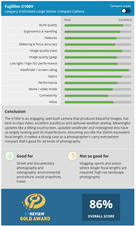 DPReview发布富士X100V评测,总评86%金奖推荐