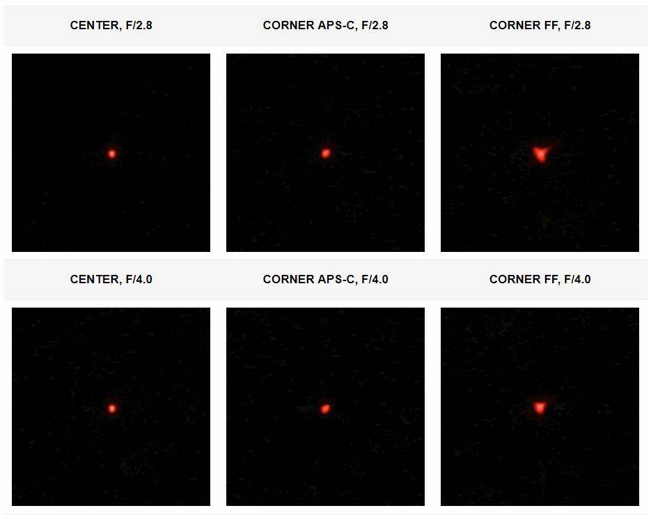 即使最大光圈只有f/2.8,这支镜头在点光源还原上还是遭遇到了很多困难。全画幅角落的慧差非常明显。即使收一档光圈到f/4之后,也还是可以注意到慧差的存在。