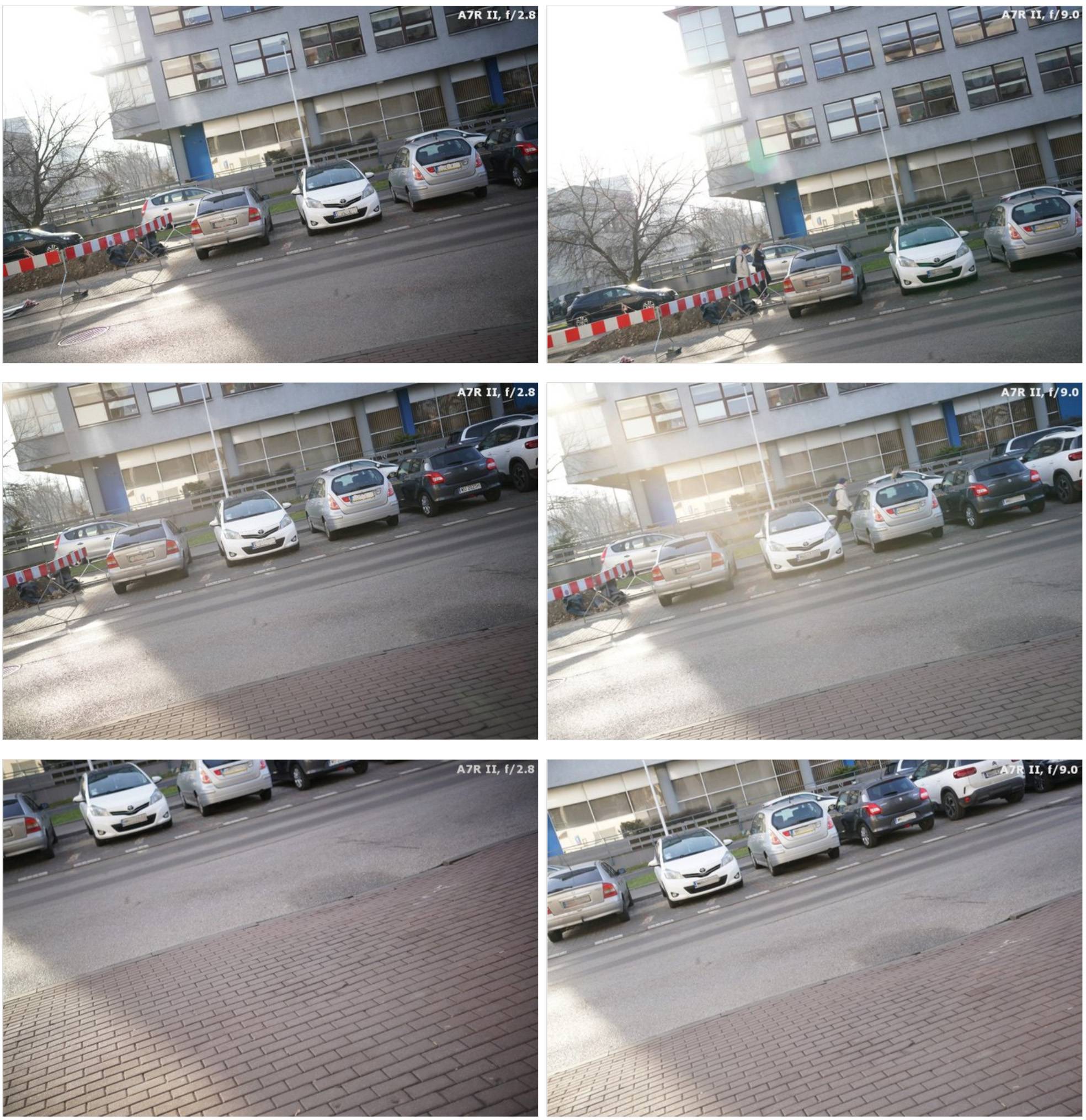 光圈全开时的表现很有趣,从中心到边缘,整个画面的锐度非常均匀,并且锐度也在可接受范围之上。图像中心画质随着收光圈迅速上升,最大能达到65lpmm,跟那些“锐度头”的差距还是很大的。中心画质和边缘画质,适马45/2.8C都战胜了三阳AF35mm f/2.8 FE和索尼35mm f/2.8ZA。在APS-C边缘,索蔡35/2.8ZA无法达到40lpmm,三阳无法达到53lpmm,适马却能超过56lpmm。全画幅边角锐度,适马更是远远超过了索尼蔡司。