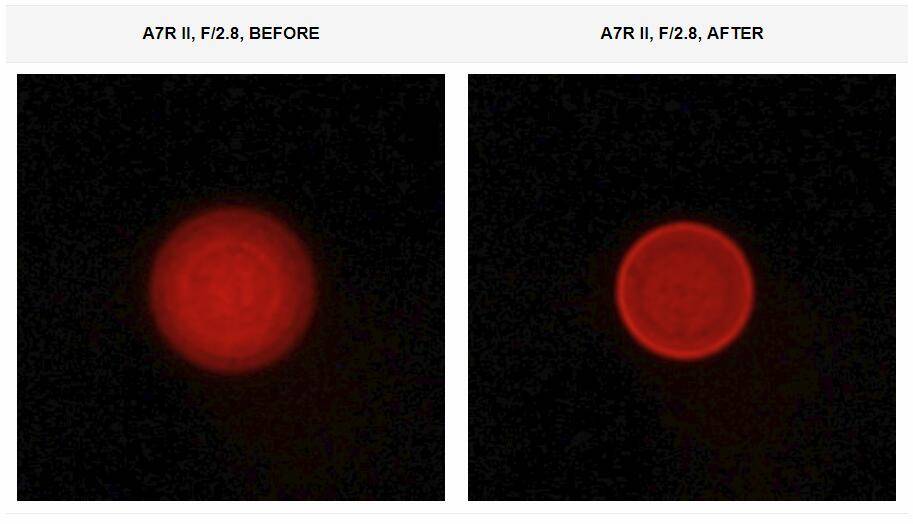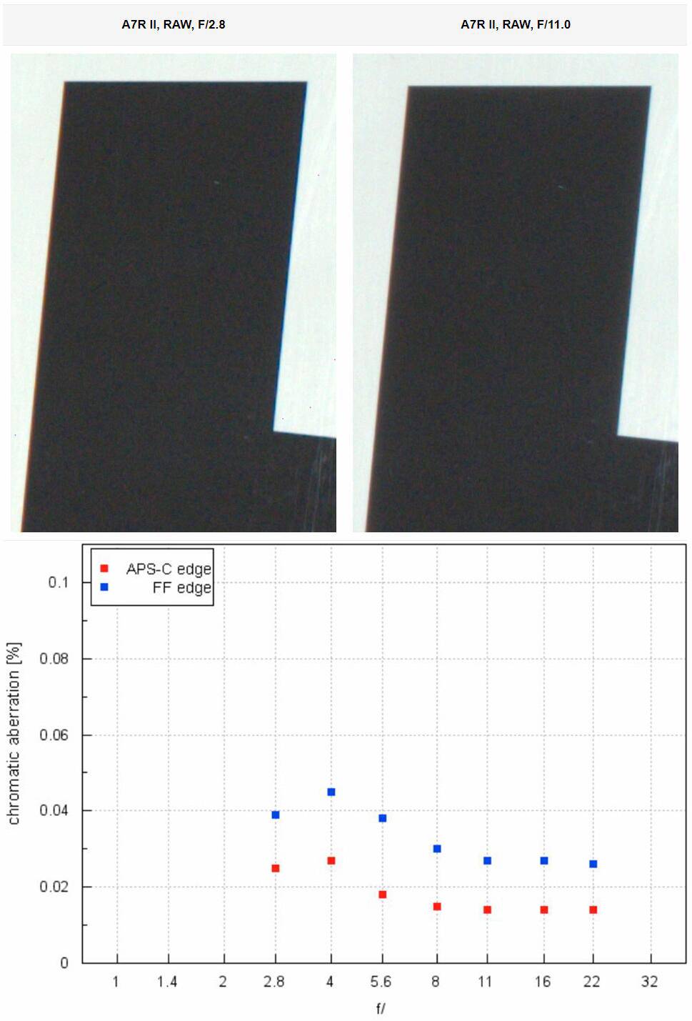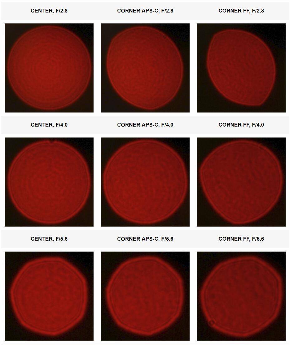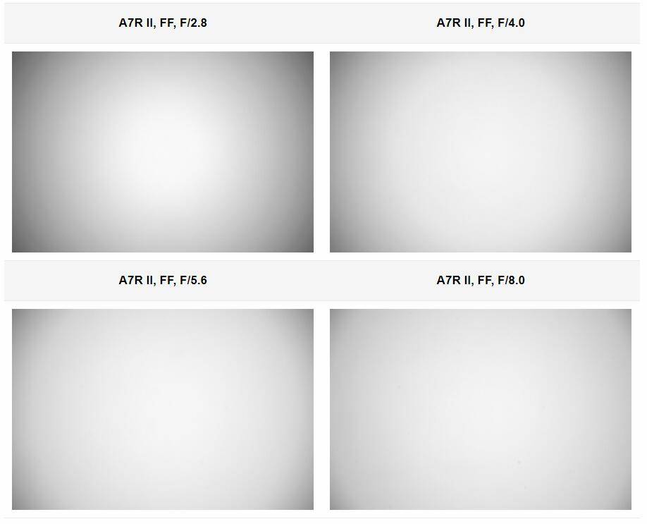 全画幅下,f/2.8=-2.76EV,f/4=-2.01EV,f/5.6=-1.69EV,f/8=-1.38EV,f/11=-1.11EV,f/16=-0.94EV。全画幅时暗角挺重,且收光圈也不能有效改善。