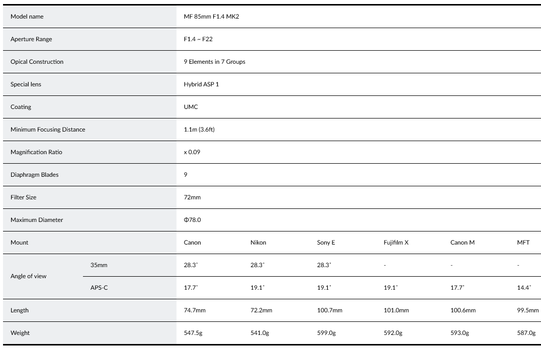 此次发布的两款镜头为MF 14mm F2.8 MK2、MF 85mm F1.4 MK2。两款镜头为之前老款的升级换代型号,新款MK2增加了焦点锁定(MF 14mm F2.8 MK2)和无极光圈切换功能,并且具备全天候密封性。卡口有佳能EF、EF-M、尼康F、索尼E、富士X和MFT多种版本,具体规格如下: