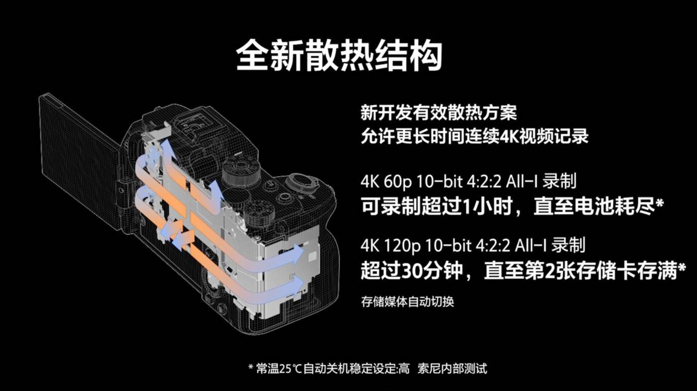 性能强大了是不是也容易发热呢?毕竟现在大家都关心热不热的问题,α7S III这次把被动散热也作为卖点,全新设计的Σ (sigma) 型散热结构,反正就告诉你常温25℃下能一直录,不是把电录没就是把卡录满,不要担心。