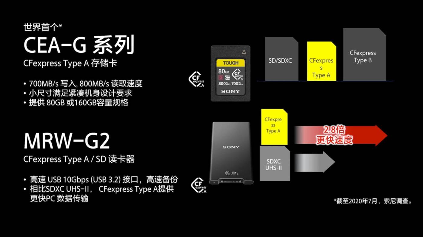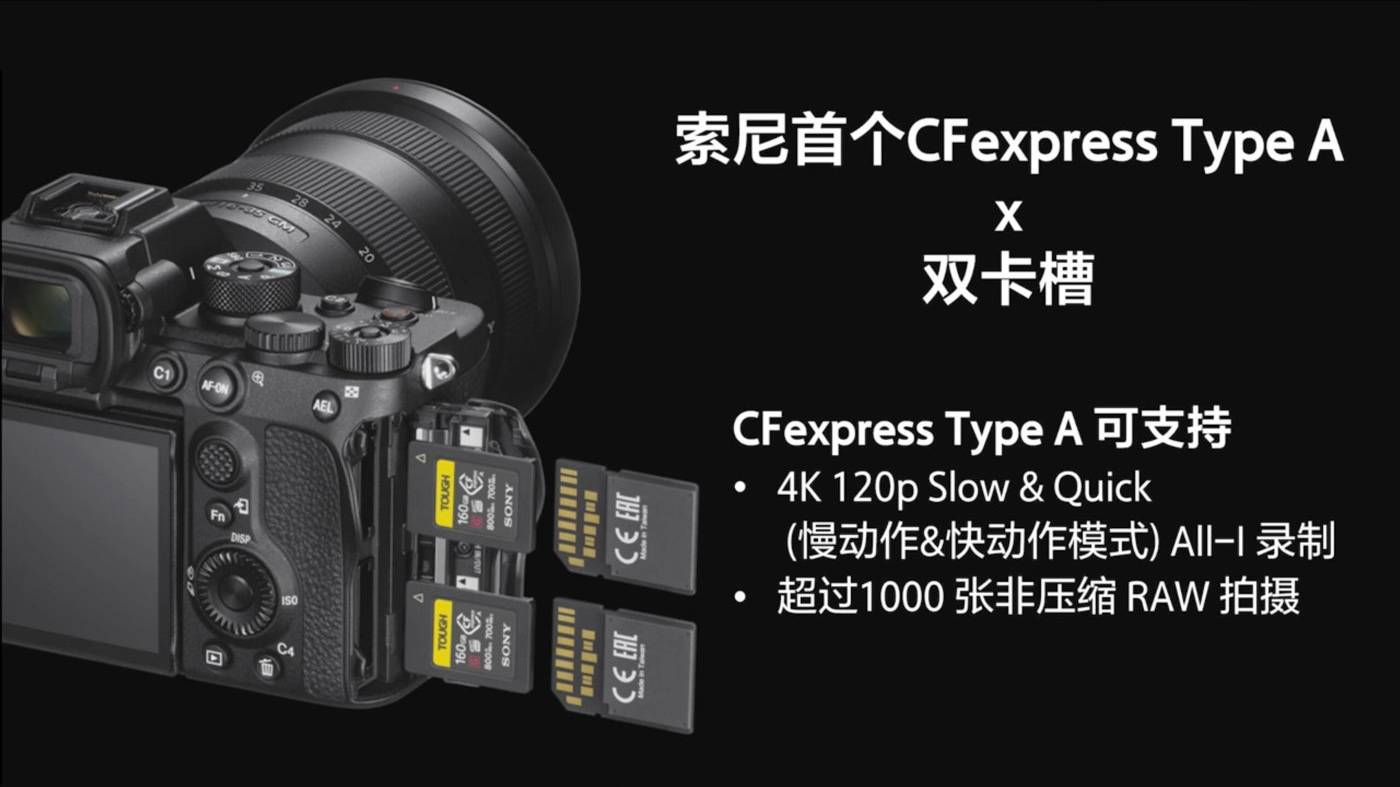 存储方面这次新增的 CFexpress Type A 储存卡主要用在两个地方:1.使用S&Q模式 4K 120P All-I录制,这个时候码流为1200Mbps 2.持续拍摄超过1000张非压缩RAW照片