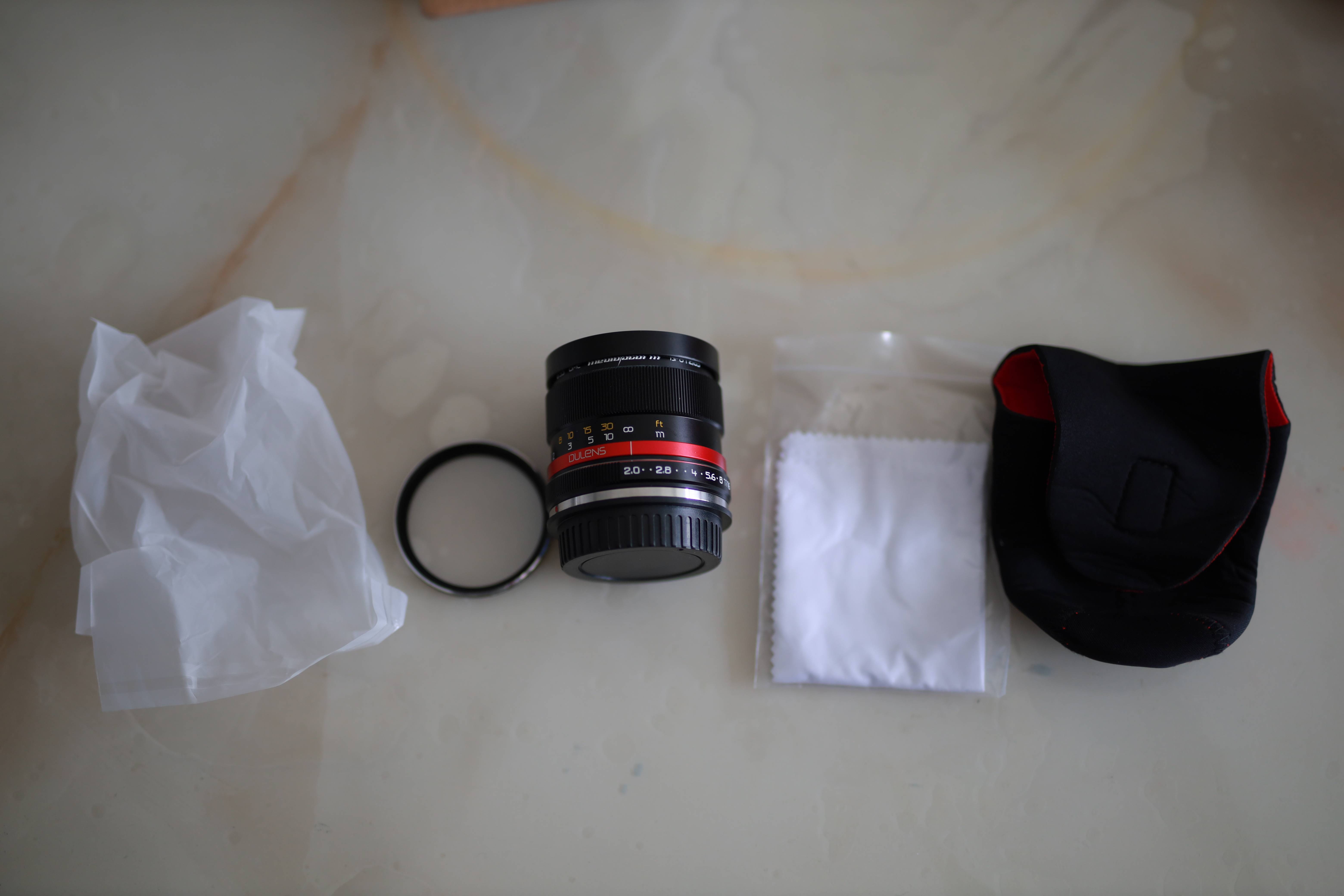 从它的外包装以及内部附件来看,绝对是和“质感”二字毫无关系的,镜头袋相当敷衍,和精致的镜头本体产生了极强的对比。