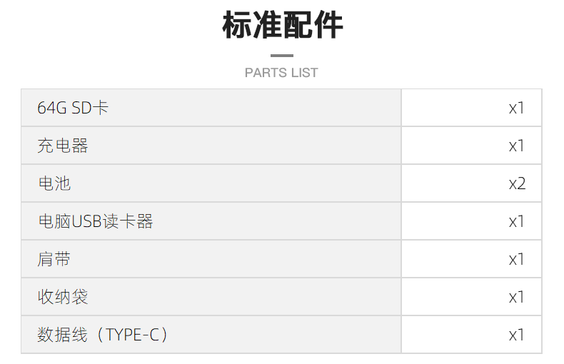 64G SD卡、充电器、电池*2、电脑USB读卡器、肩带、收纳袋、数据线(TYPE-C)