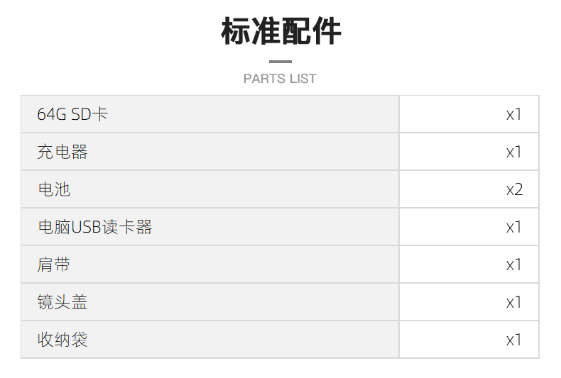 64G SD卡、充电器、电池*2、电脑USB读卡器、肩带、镜头盖、收纳袋