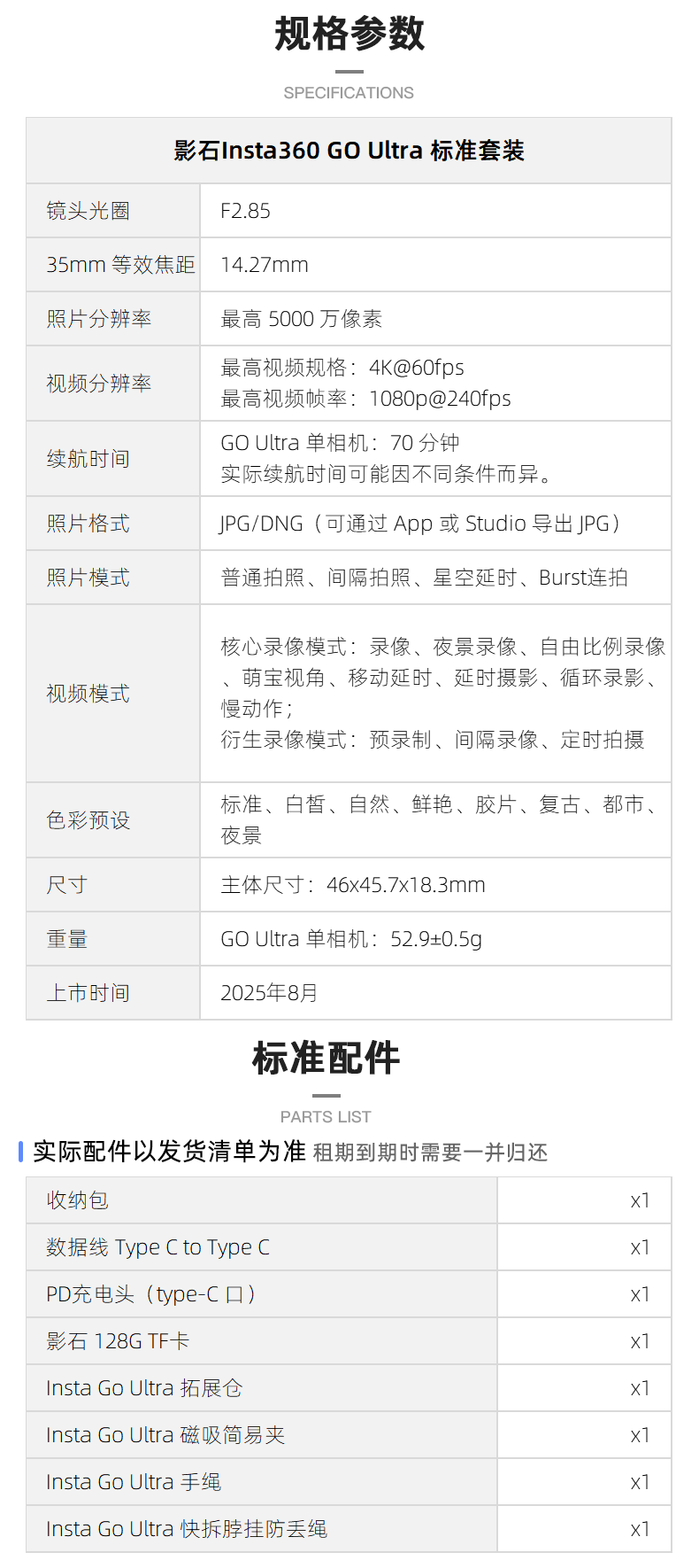 收纳包、数据线 Type C to Type C、PD充电头(type-C 口)、影石 128G TF卡、Insta Go Ultra 拓展仓、Insta Go Ultra 磁吸简易夹、Insta Go Ultra 手绳、Insta Go Ultra 快拆脖挂防丢绳